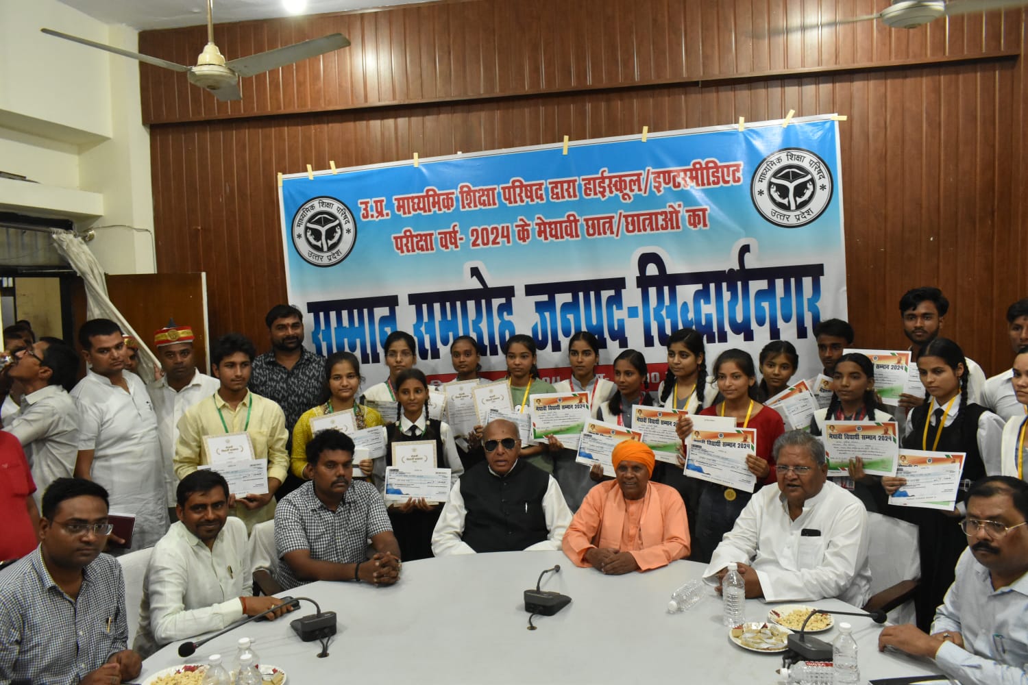 जिलाधिकारी डॉ0 राजागणपति आर0 ने उत्तर प्रदेश माध्यमिक शिक्षा परिषद द्वारा हाईस्कूल/ इंटरमीडिएट परीक्षा वर्ष 2024 के मेधावी छात्र-छात्राओं के सम्मान समारोह में सांसद डुमरियागंज,विधायक कपिलवस्तु, शिक्षको, अभिभावकों एवं बच्चों का स्वागत किया। जिलाधिकारी ने बताया कि जनपद सिद्धार्थनगर से राज्य स्तर पर सर्वाेच्च अंक प्राप्त करने वाले तीन छात्रों को मुख्यमंत्री उ0प्र0 योगी आदित्यनाथ द्वारा लखनऊ में सम्मानित किया किया गया।
