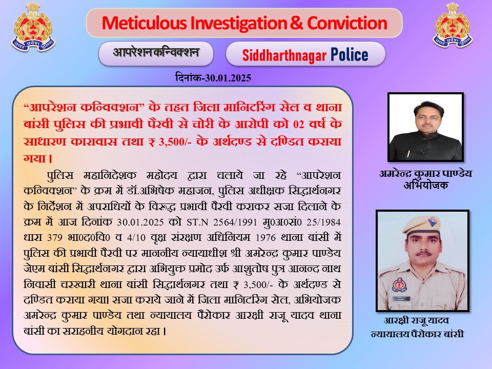जनपद सिद्धार्थनगर/दिनांक 30 जनवरी 2025 आपरेशन कन्विक्शन” के तहत जिला मानिटरिंग सेल व थाना बांसी पुलिस द्वारा चोरी…